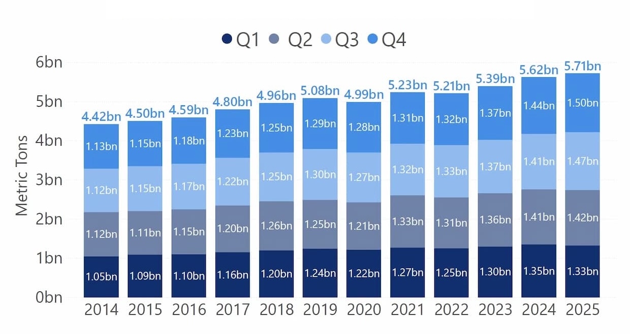 調査・データAXSマリン(フランス)は15日、2025年の世界海上ドライバルク貨物輸送量が過去最高の57億トンに達したと発表した。前年比では1.7%の増加で、特に年後半の需要回復が全体の成長をけん引した。