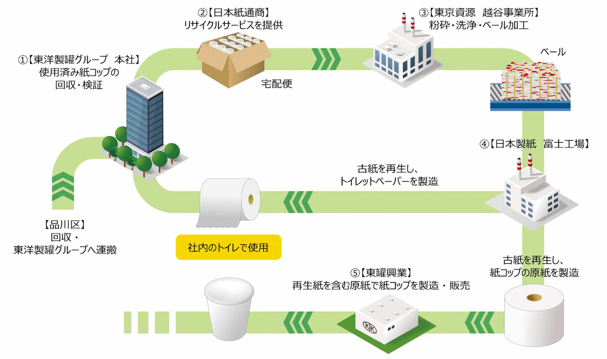 ワンウェイ容器としての完成形、象徴ともいえる紙コップを、循環型の資源として再定義しようという取り組みで、同社はどんな社会の実現を目指すのか。狙いは単なるリサイクルではない。消費者行動、自治体の制度運用、回収・選別・再生の物流網(静脈物流)をつなぎ直し、サーキュラーエコノミーを“社会実装”することにある。