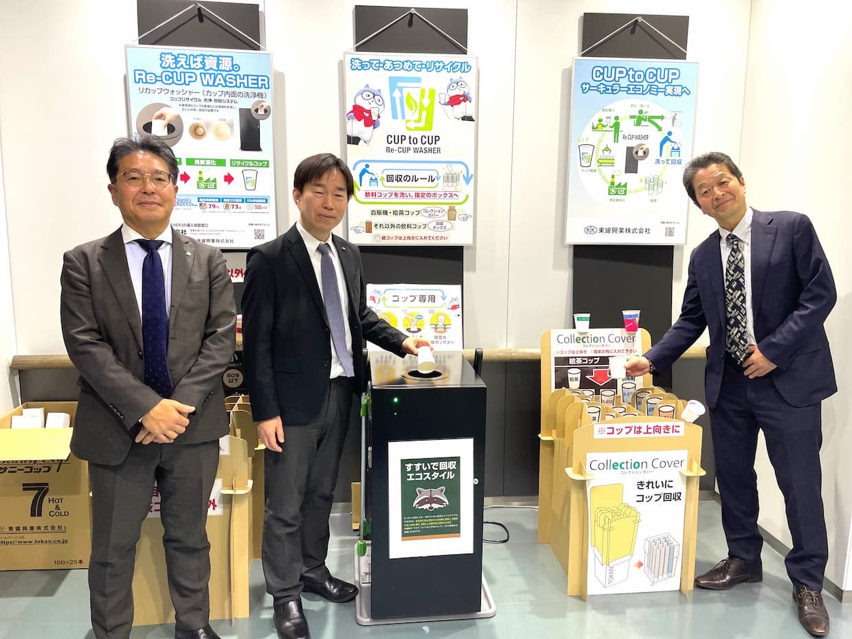 東缶興業環境部ジェネラルマネージャーの久保英治氏は、「まずは消費者自身も紙コップの再資源化、静脈物流におけるサプライチェーンの一角であるという意識と行動の変容を促すこと。より強力な呼びかけとなるよう、自治体との連携、スポーツイベントなどで周知に取り組んでいる」と語る。まずは回収設計をしやすいクローズドな現場に専用洗浄機と回収ボックスを設置した回収ステーションを整えて、来場者の協力を求めることから取り組みを本格化した。