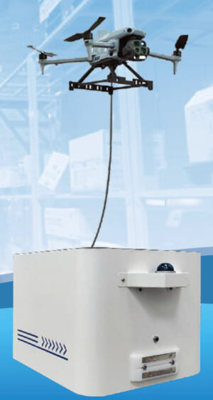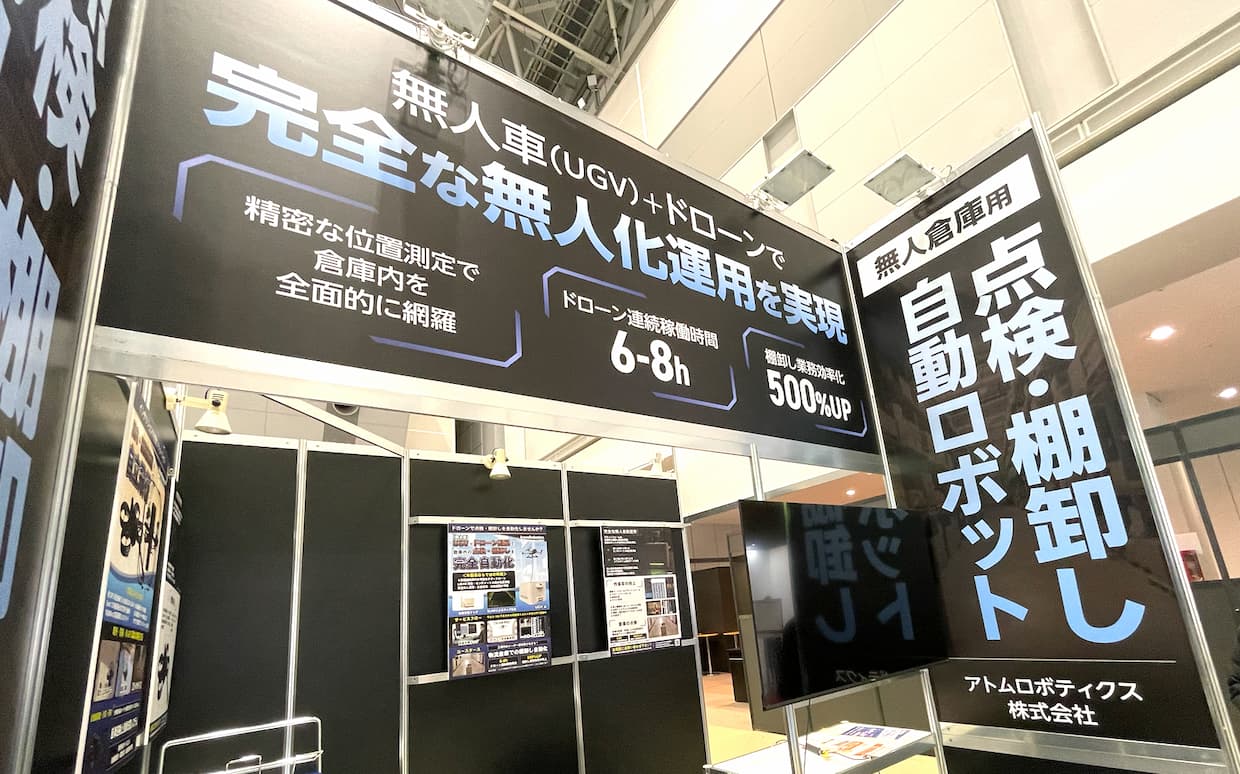 イベントアトムロボティクス(東京都渋谷区)は、21日に開幕した「第5回スマート物流EXPO」に出展し、物流倉庫の棚卸し完全自動化を実現する新システム「凧(たこ)シリーズ」を紹介している。このシステムは、自律移動型無人車(UGV)とドローンを連携させることで、倉庫内の点検および棚卸し作業を完全自動化するもの。ドローンの発着と充電ポートを兼ねるUGVが庫内の所定位置まで自動走行し、そこから「テザードローン」(有線型ドローン)が発着、棚単位での階層別棚卸しを完全自動で実行するユニークな仕組みだ。