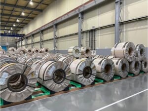 新倉庫は従来と同様に鋼材を中心に取り扱う。サビ抑制を目的に換気機能を強化し、換気用ダクトの増設や東西に大型開口部を設けるなど、品質維持を意識した設計とした。重量物搬送では無人搬送車(AGV)を導入し、将来的な自動操縦機能の追加に対応可能な天井クレーン2基を設置するなど、段階的な自動化を見据えた設備構成としている。