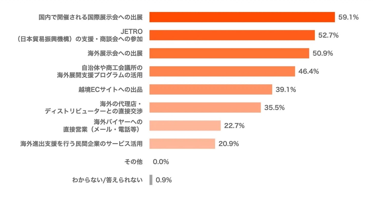 調査によると、海外販路開拓の施策として最も多く実施されたのは「国内開催の国際展示会への出展」(59.1%)で、「JETRO支援・商談会への参加」(52.7%)、「海外展示会への出展」(50.9%)が続いた。これらの施策を通じて「継続的な取引に繋がり、十分な利益が出ている」と回答した企業は62.4%、一方で「利益は期待ほどではない」は28.4%、「継続に至っていない」は8.3%だった。
