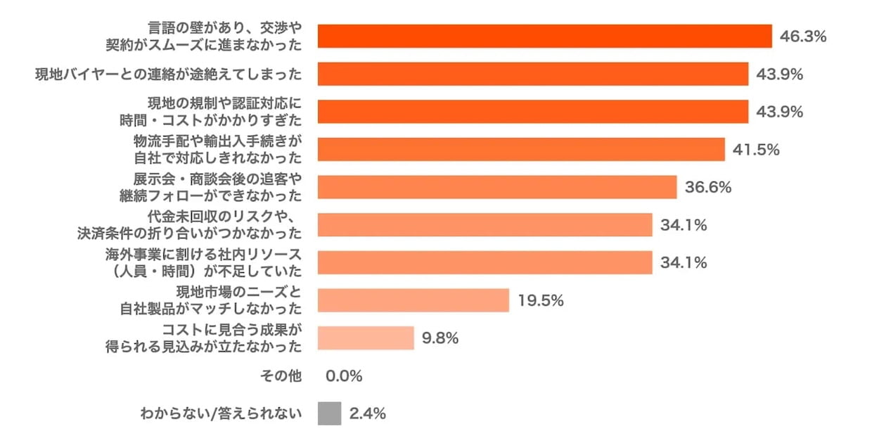 成果が期待通りでなかった理由では、「言語の壁」(46.3%)、「現地バイヤーとの連絡断絶」「現地規制や認証対応の負担」(ともに43.9%)が挙げられた。また、専任担当者がいない企業では、70.0%が「専門知識やノウハウ不足」、55.0%が「市場調査や情報収集に手が回らない」と回答した。