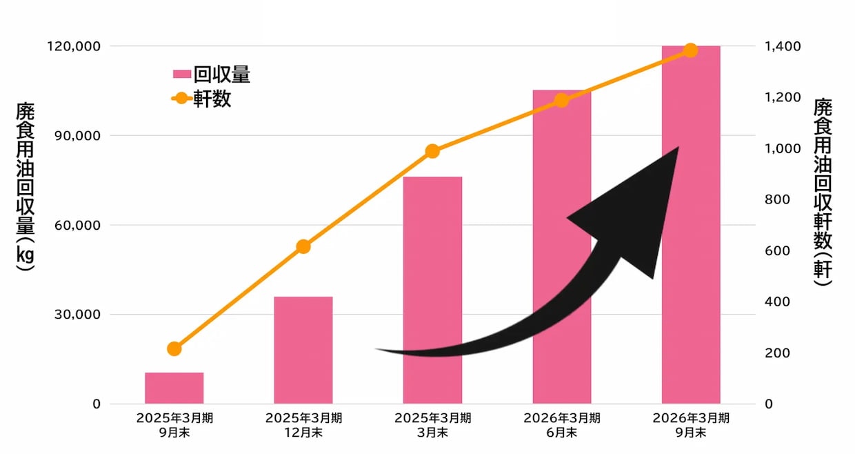 同社は24年6月より、首都圏・関西・九州の営業エリアを対象に廃食用油回収を開始。配送時に同時回収する方式を採用することで、追加の配送負担なく再資源化が可能な仕組みを構築している。回収した油は、レボインターナショナルを通じてSAF(持続可能な航空燃料)などへ再資源化される。