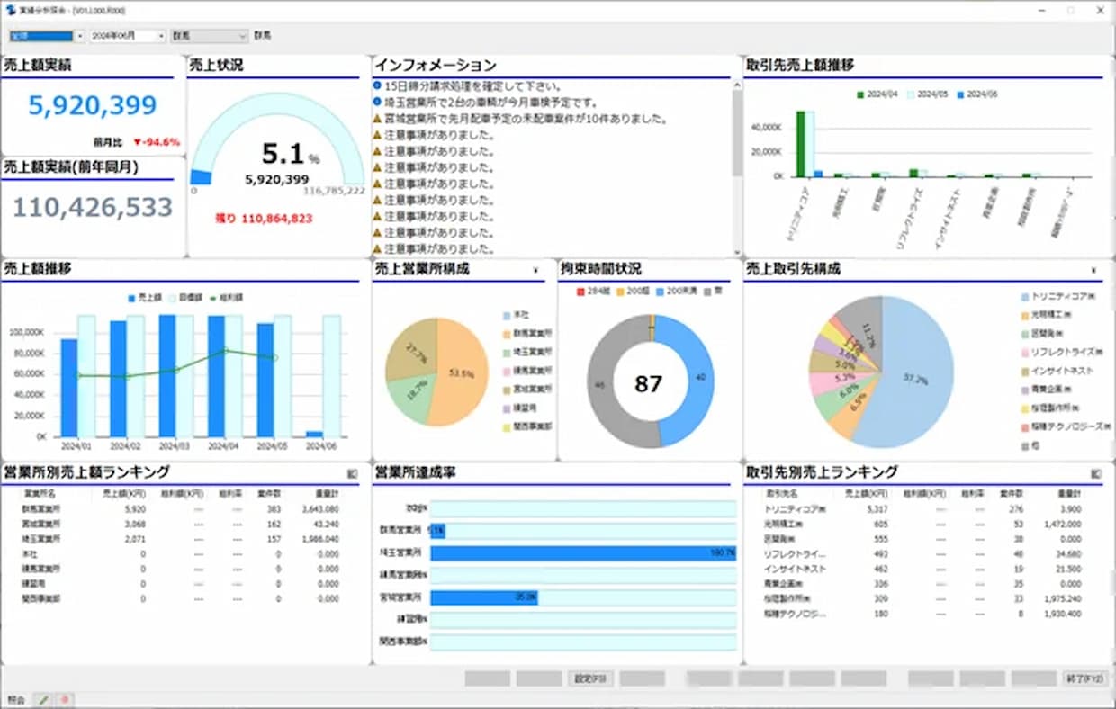 また、収支や稼働率をリアルタイムで把握できるダッシュボード、荷主別・車両別・ドライバー別の収益分析機能を備え、経営判断の材料を提供する。労働・拘束時間の可視化や、法改正に対応した帳票の自動作成も可能。