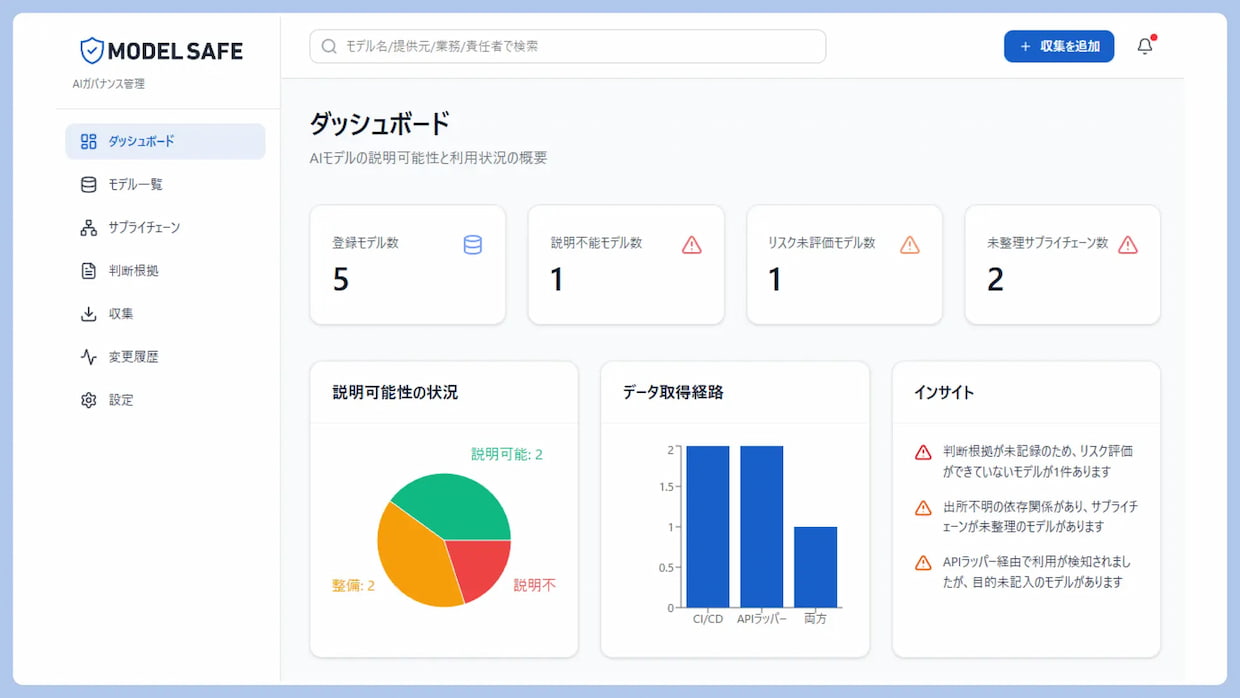 MODEL SAFEは、AIモデルやAPI、ライブラリー、設定、利用環境などの構成要素の変更を自動的に検知・記録することで、AIの利用状況とリスクを常時把握可能にするプラットフォーム。台帳の手動更新や属人的な運用を不要とし、AIガバナンスを“仕組み”として実装する。β版では、構成要素の変更や利用用途の変化、ポリシー逸脱の兆候などのリスクを重点的に可視化する。
