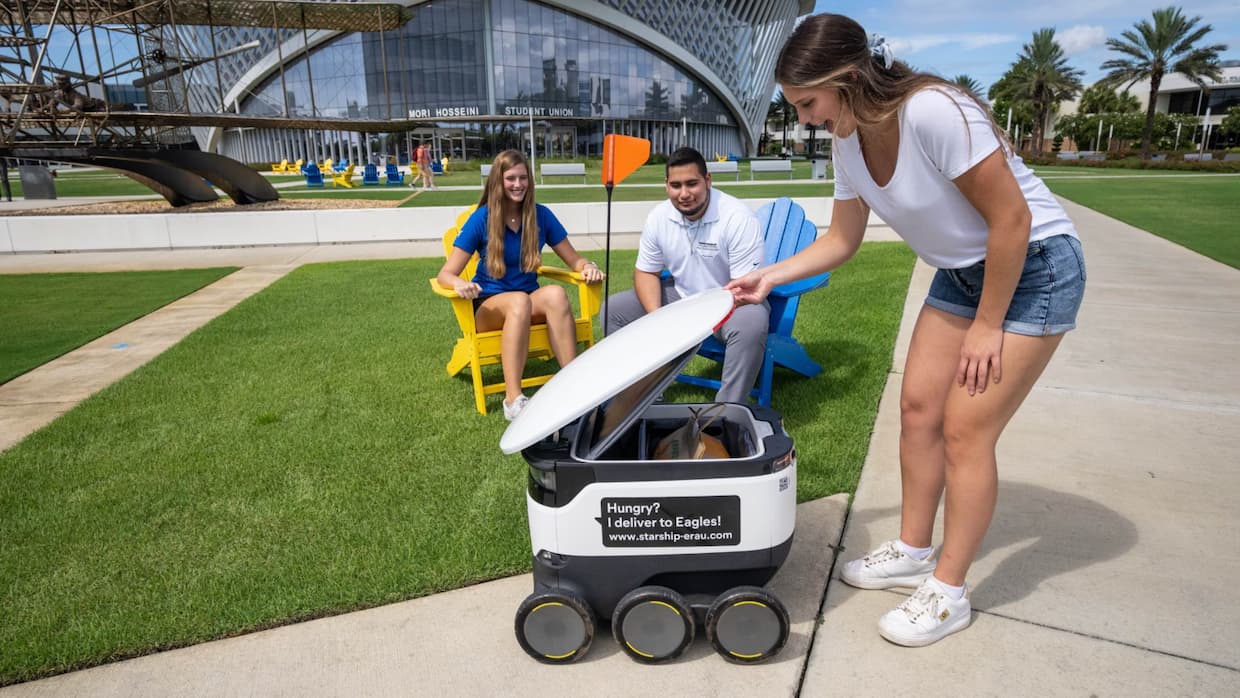 大学キャンパスでは、配達ロボットを活用したサービスが導入されている。同社のロボットは、米国内65大学キャンパスで運用されており、学内での飲食物配送に利用されている。