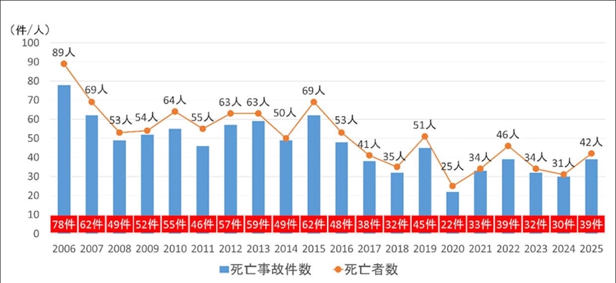 発表によると、25年の高速道路内での死亡事故件数は39件、死亡者数は42名となり、24年に比べて事故件数が9件、死亡者数が11人増加した。「単独事故」や「対走行車両事故」を中心とした死亡事故は合計27件・29人を占めるなど、重大事故の傾向が見られた。