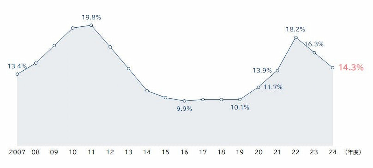 調査・データ帝国データバンク(TDB、東京都港区)は29日、「ゾンビ企業」の現状分析(2026年1月版)をまとめた。2024年度のゾンビ企業率は14.3%と2年連続で低下し、企業数は推計21万社まで減少した。コロナ後の経済正常化や倒産・休廃業の増加による新陳代謝が進んだことが背景にある。一方で、金利上昇が本格化すれば再び増加に転じる可能性が高いと警鐘を鳴らす。