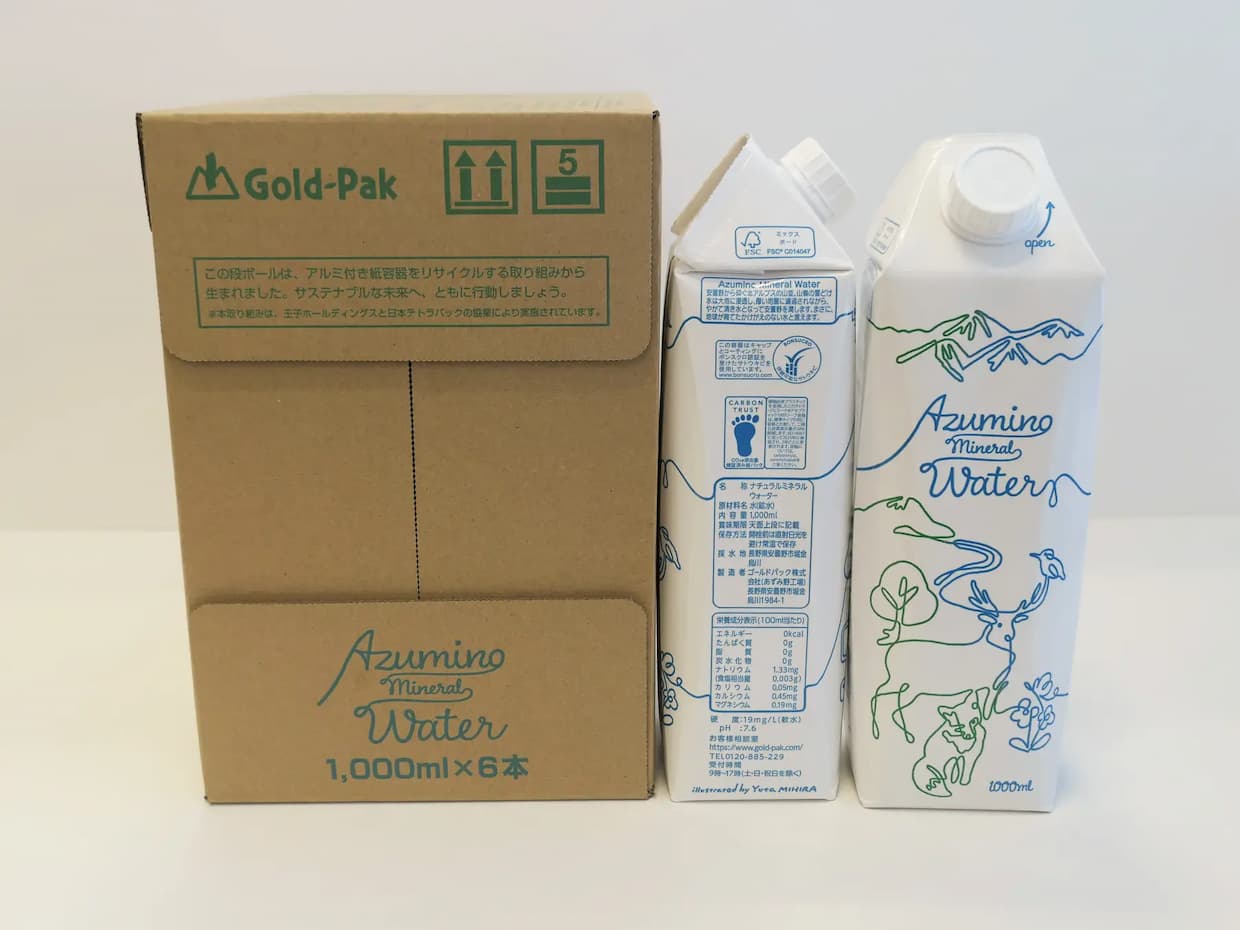 ▲アルミ付き紙容器を原料とした再生段ボールとAzumino Mineral Water(出所:日本テトラパック)