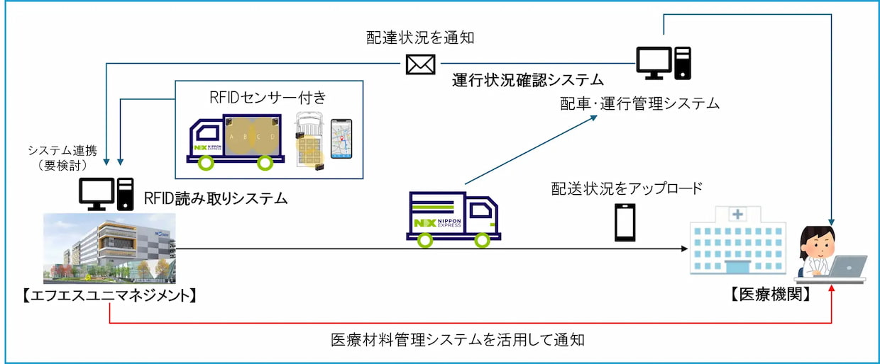 輸配送では日本通運と連携し、医療材料とトラックの双方にRFIDセンサーを装着。出荷から納品までの位置情報をリアルタイムで可視化するトラッキングシステムを構築する。積み忘れや誤配送の防止に加え、問い合わせ対応や検品作業の簡素化を通じた業務負荷軽減を狙う。