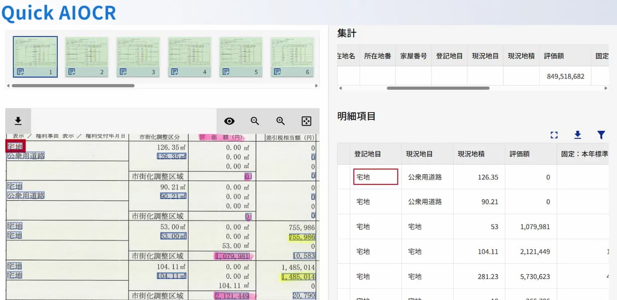 鈴与のQuick AIOCRは、画像解析による高精度な文字認識機能に加え、ノーコードでのデータ加工ツールと分類推論AI(人工知能)を組み合わせた次世代型のクラウドサービス。従来のAI-OCRでは対応が難しかった非定型帳票にも対応し、手修正の手間を大幅に削減できるのが特長だ。主な対象書類は、固定資産課税台帳(名寄帳・明細書)や請求書、納品書など。トライアル導入実績として、鉄道・不動産・ホテル業界などが挙げられている。