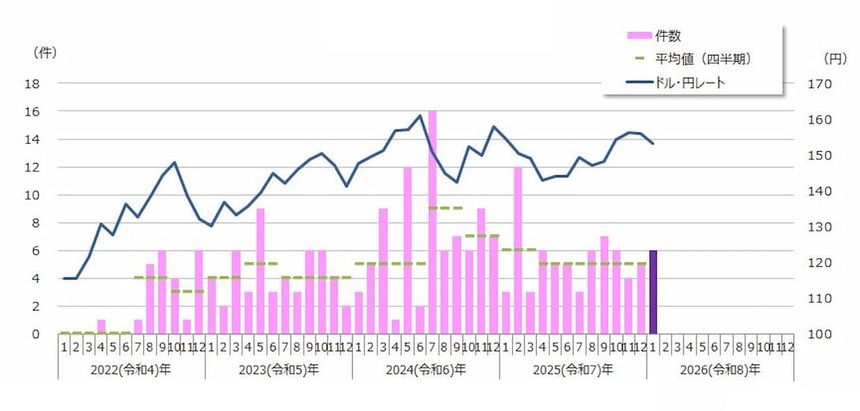 調査・データ東京商工リサーチ(東京都新宿区)は2月2日、ことし1月の「円安」関連倒産が6件となり、1月としては過去10年間で最多だったと発表した。
