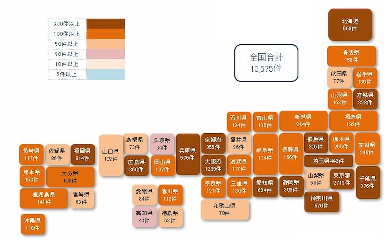 コロナ破たんの累計は、2020年2月の第1号発生から1万3575件となった。全国企業数に対する破たん率は0.378%で、企業300社強に1社の割合。都道府県別では東京都が最も高く0.648%、次いで福岡県(0.601%)、宮城県(0.551%)と続く。最も低かったのは岐阜県(0.160%)だった。