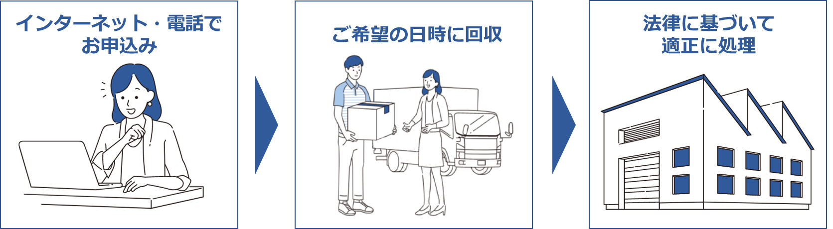 同サービスでは、テレビ・冷蔵庫・洗濯機といった大型家電から電子レンジ・パソコン・時計などの小型家電まで、自宅からの搬出・回収に対応。収集運搬許可を持つ事業者が、申し込み者の希望日時に自宅を訪問し、回収後は家電リサイクル法および小型家電リサイクル法に則った処理を行う。