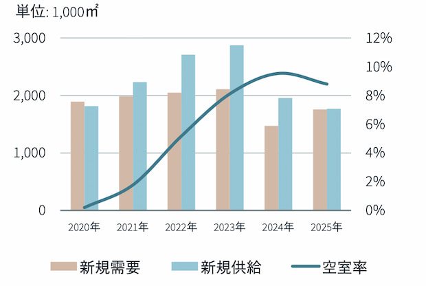 投資市場も底堅く、想定価格は前年同期比0.8%上昇した。金利上昇でキャップレートはわずかに上昇したものの、賃料成長が価格を下支えした。JLLは今後も需要の安定と開発抑制を背景に賃料上昇基調が続くとみており、立地や競争力の高い物件を中心に価格上昇も継続すると予測している。