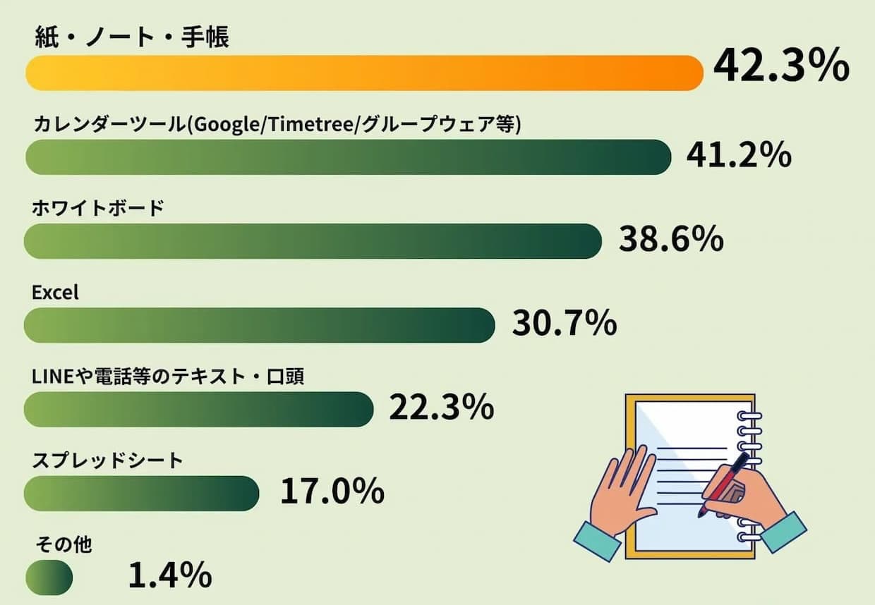 スケジュール管理手法では、「紙・ノート・手帳」が42.3%で最多となり、「ホワイトボード」が38.6%、「Excel(エクセル)」が30.7%と続いた。汎用カレンダーツールの利用も41.2%に上ったが、その6割超がアナログ手法と併用しており、デジタル管理のみで完結している現場は少数にとどまった。
