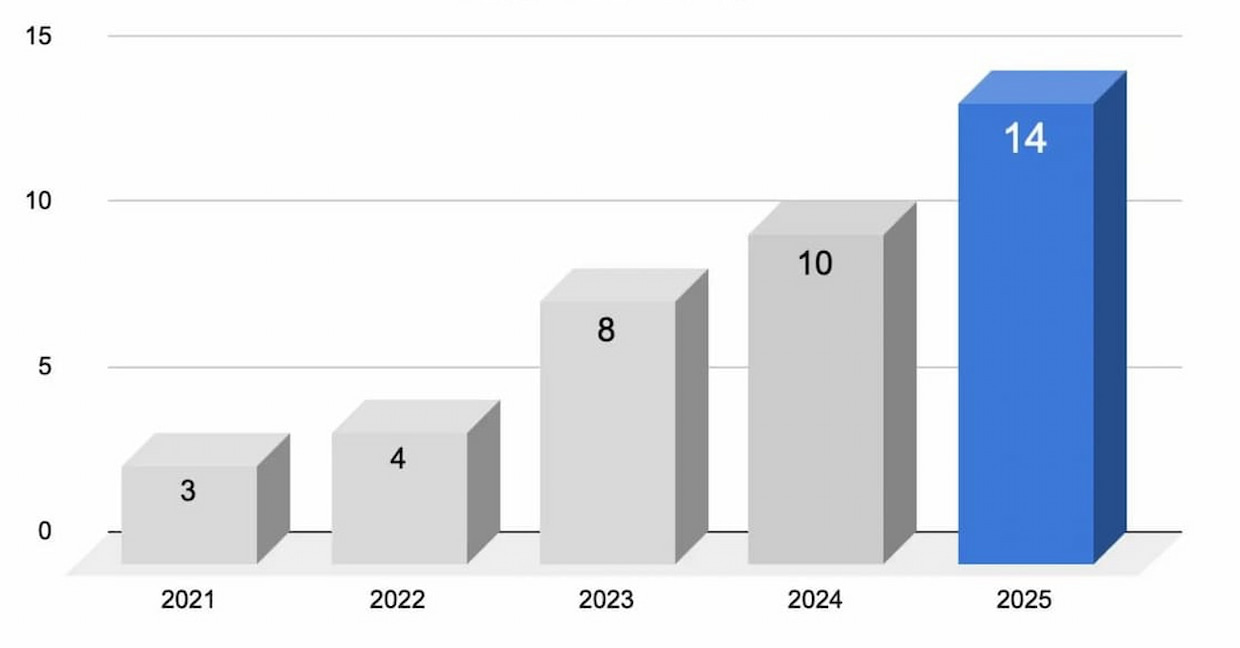 ロジスティクス日鉄物産システム建築(東京都港区)は5日、危険物倉庫の施工実績が過去5年間で20件・39棟に拡大したと発表した。2021年の施工3件から25年には14件に増加し、同期間で4.6倍に成長した。