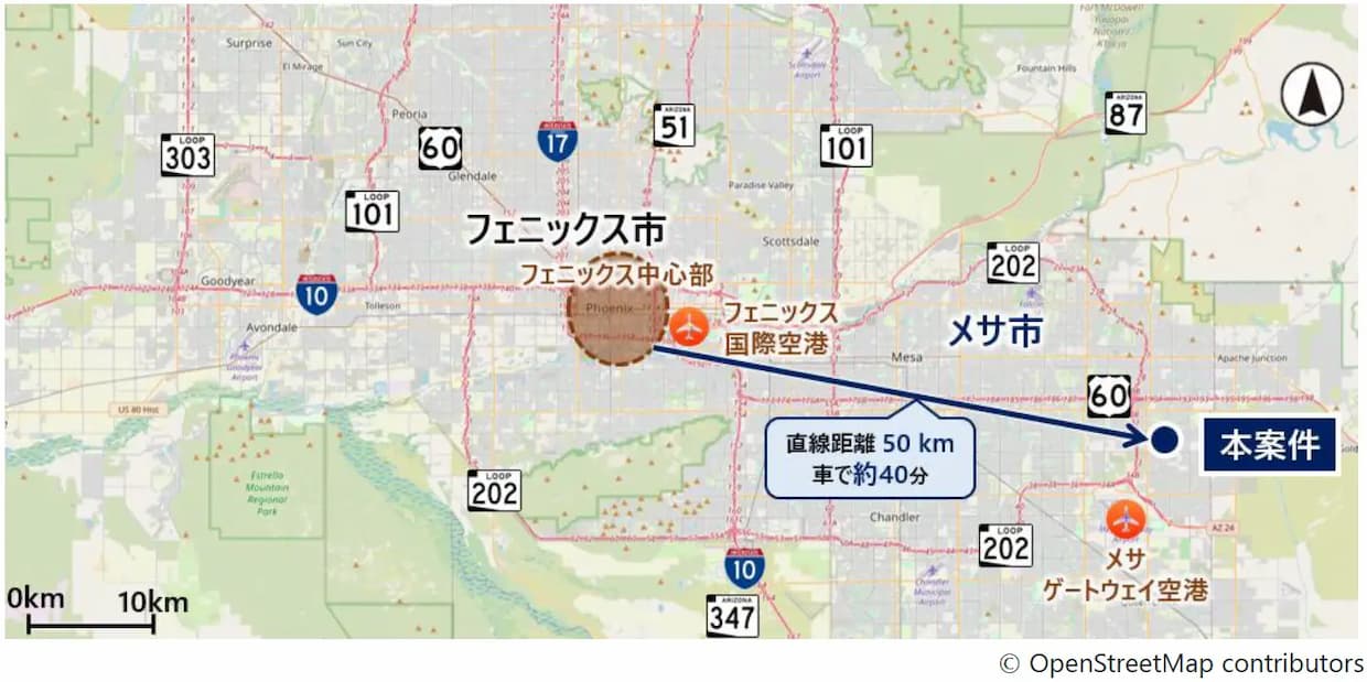 メサ市は、人口増加と企業進出が進むフェニックス都市圏に位置し、高速道路や空港へのアクセスに優れる物流集積エリアとして需要拡大が見込まれている。開発地周辺にはデータセンターや物流拠点が集積しており、産業インフラの厚みが投資判断を後押しした。