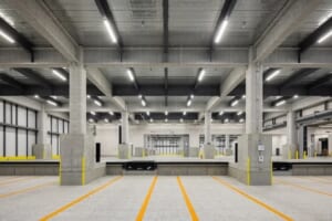 新施設は、鉄骨造地上4階建てで、延床面積1万4513平方メートル。11台同時接車可能な高床バースやトラック待機スペースを備え、柔軟な入出庫オペレーションが可能な設計となっている。昇降設備として、荷物用エレベーター2基、垂直搬送機1基、ドックレベラー2基を配置。庫内は有効天井高5.5メートル以上、床荷重は1平方メートルあたり1.5トンを確保し、各階で2.5トンフォークリフトの運用に対応する。