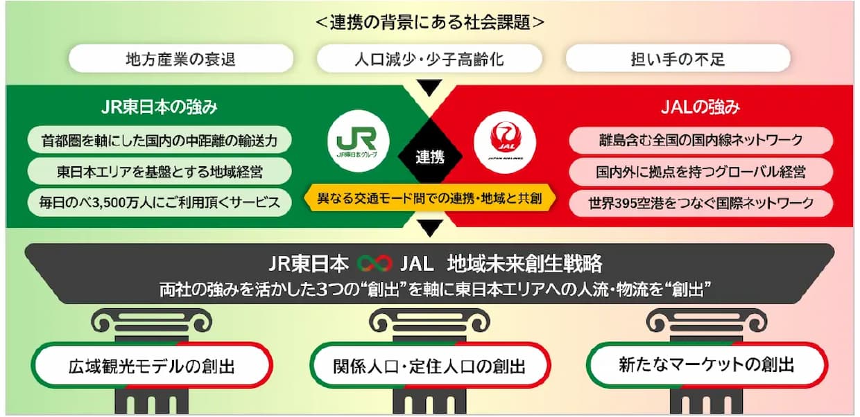 ロジスティクス東日本旅客鉄道(JR東日本)と日本航空(JAL)は6日、地方創生に向けた包括連携協定を締結し、「地域未来創生戦略」を始動したと発表した。両社の強みを融合し、「広域観光」「関係・定住人口」「新たなマーケット」の3つの創出を軸に、東日本エリアの活性化を目指す。