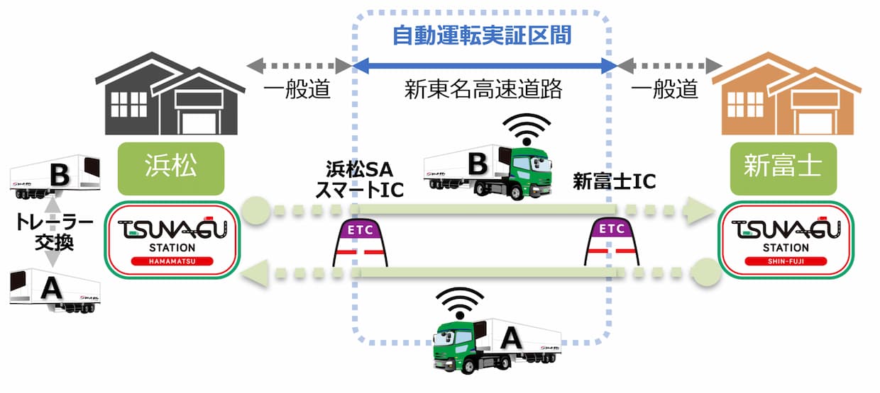 行政・団体センコー(大阪市北区)とオリックス自動車(東京都港区)、ロボトラック(中央区)で構成する「L4物流自動運転トレーラー推進協議会」は9日、国土交通省の実証事業として、セミトレーラー型自動運転トラックによる初の公道実証走行を10日から開始すると発表した。実証はセンコーが展開する中継拠点「TSUNAGU STATION 浜松」と「TSUNAGU STATION 新富士」を結び、新東名高速道路・新富士インターチェンジ(IC)-浜松SAスマートIC間で実施する。