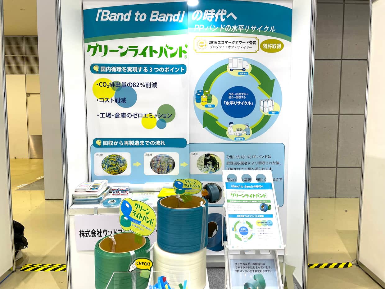 イベントウッドプラスチックテクノロジー(東京都文京区)は、12日に開幕した「ロジスティクスソリューションフェア2026」に出展し、使用済みPPバンドを再資源化したリサイクルPPバンド「グリーンライトバンド」を紹介している。