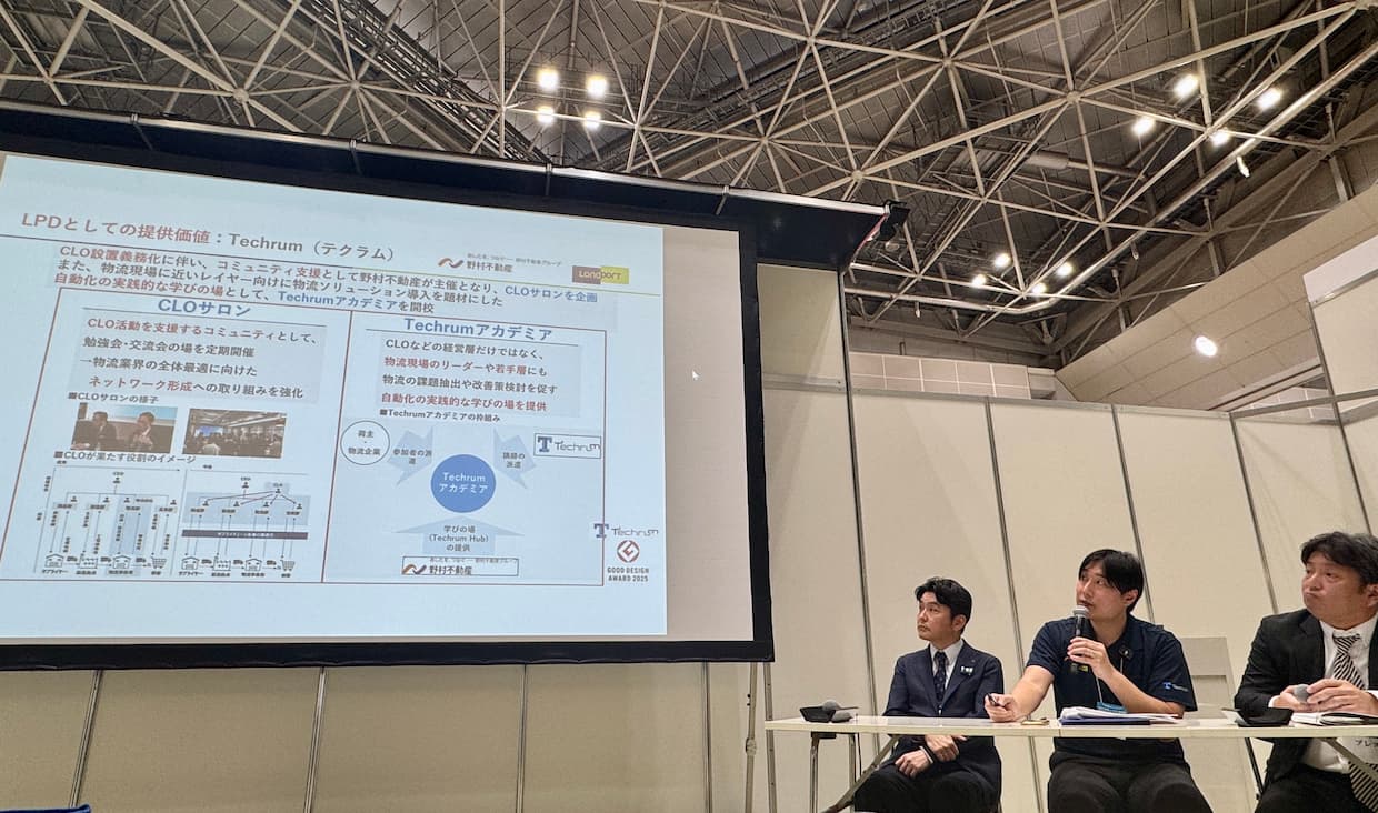 さらに佐久間氏は、LPD(ロジスティクス・プロデューサー)としての支援の在り方にも言及した。野村不動産が推進する物流課題の企業間共創プログラム「Techrum」(テクラム)やLandport横浜杉田での立体自動倉庫のシェアリングなどの取り組みを紹介し、設備投資や倉庫面積を波動に合わせて平準化する新たな拠点運用の可能性を示した。