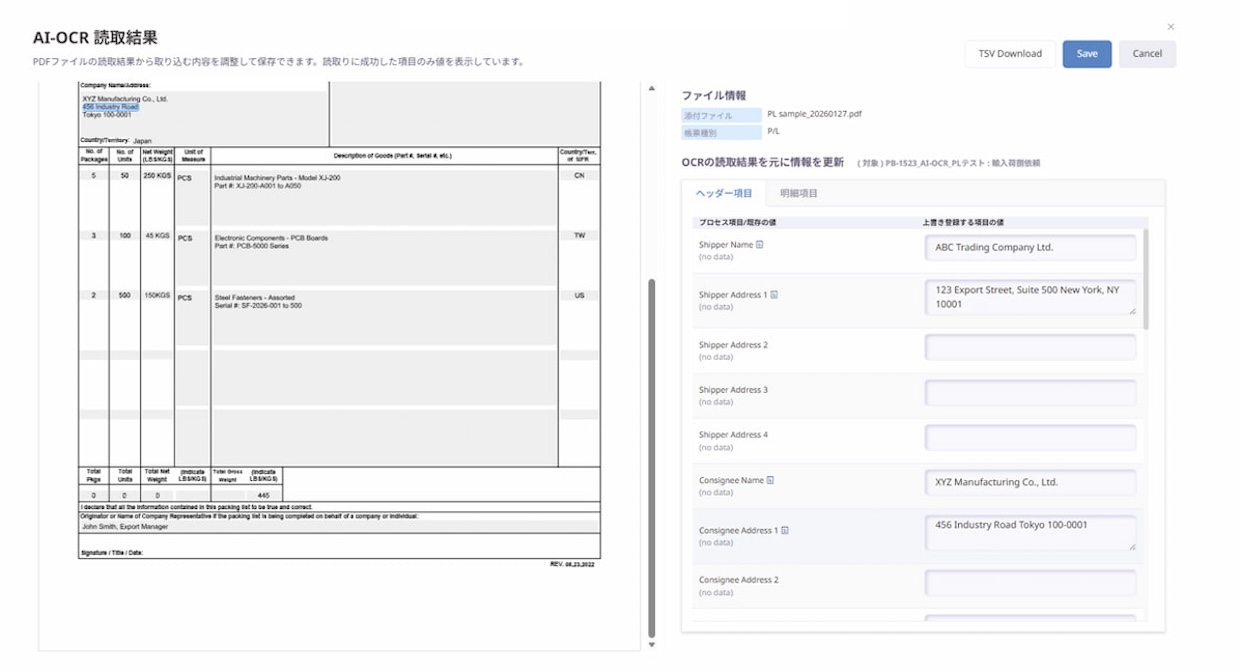 新機能では、P/Lに記載された梱包単位、個数、重量などの情報を読み取ることで、物流管理や倉庫での荷受け準備に活用できるほか、通関申請に必要な情報を網羅的に取得し、申告書類の作成を効率化できる。読み取りデータはTSV形式で出力可能で、既存の基幹・通関システムとの連携も容易となる。