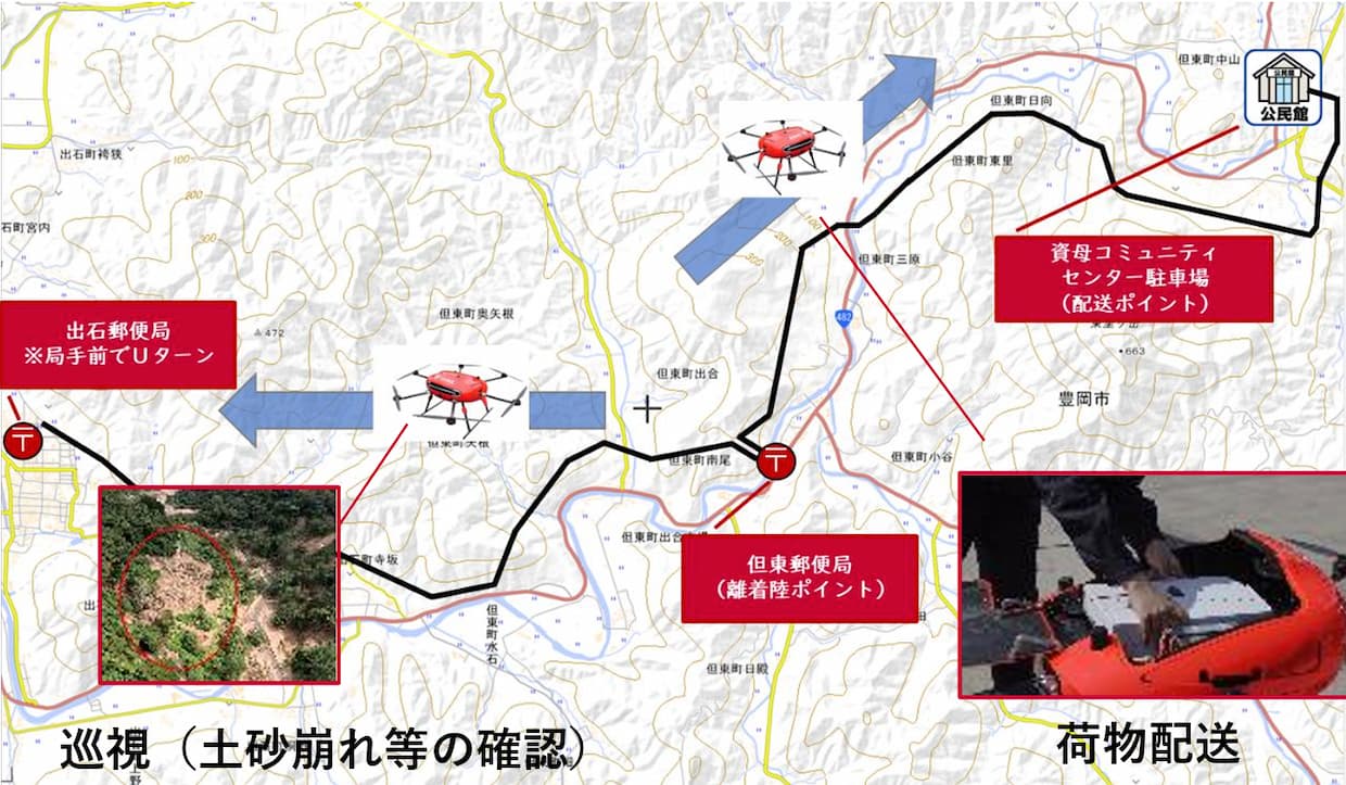 あわせて、ドローン物流の高度化も進める。26年2月24日から3月3日にかけ、同一型式ドローン2機を同時に運航する「多数機同時運航」の実証を実施する。機体はACSLが提供する長距離飛行マルチユースドローン「PF4」を使用し、1機で荷物配送、もう1機で災害時を想定した巡視を別経路で行う。同一型式による物流と巡視の同時飛行は国内初となる。