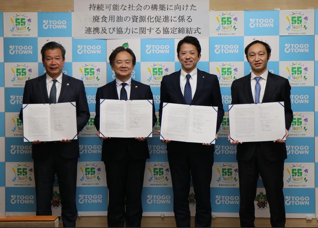 協定の主な内容は、廃食用油の回収▽東郷町内で回収した廃食用油を用いたSAFなどの製造▽資源化の情報発信機会の提供▽目的達成に必要な事項──の4点。東郷町は従来から町内2か所の資源回収ステーションで家庭系廃食用油を回収し、バイオディーゼル燃料などに再利用してきたが、今回の枠組みでは回収油をレボインターナショナルが収集し、SAFFAIRE SKY ENERGYのプラント(コスモ石油堺製油所内、2024年12月完工)に搬送してSAF原料として資源化する。給食センター由来の廃食用油も対象に加える。