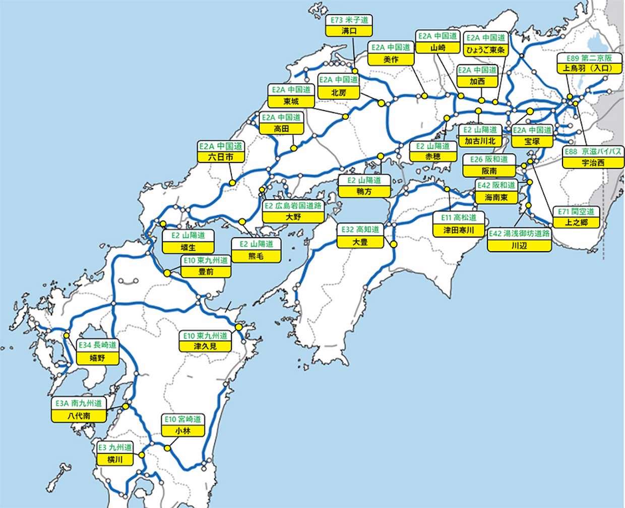 今回対象となる30料金所は、関西、中国、四国、九州の各エリアに広がる。関西では中国自動車道の宝塚、ひょうご東条、加西、山崎、山陽自動車道の加古川北、赤穂、阪和自動車道の阪南、海南東など。中国エリアでは山陽自動車道の鴨方、熊毛、埴生、広島岩国道路の大野、中国自動車道の美作、北房、東城、高田、六日市、米子自動車道の溝口が対象となる。四国では高松自動車道の津田寒川、高知自動車道の大豊、九州では九州自動車道の横川、南九州自動車道(八代日奈久道路)の八代南、東九州自動車道の豊前、津久見、宮崎自動車道の小林、長崎自動車道の嬉野など。