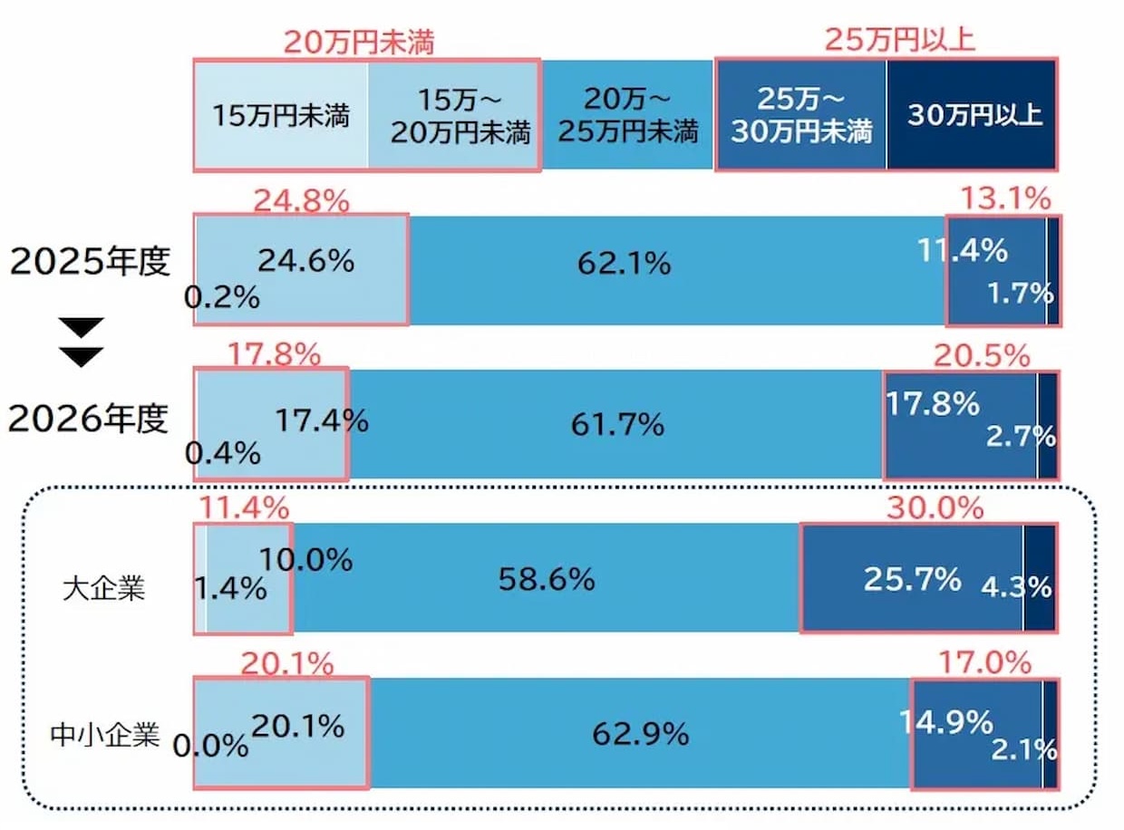 初任給水準は「20万-25万円未満」が61.7%で最多。「25万-30万円未満」は17.8%と前年度から6.4ポイント上昇し2割近くに達した。一方、「20万円未満」は17.8%と7.0ポイント低下した。大企業では「25万円以上」が30.0%に達したのに対し、中小企業は17.0%にとどまった。