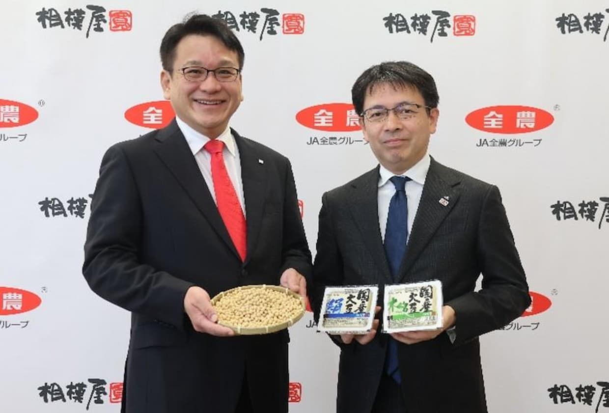 ロジスティクスJA全農は18日、相模屋食料(群馬県前橋市)と国産大豆流通に関する共同スキームを構築すると発表した。産地倉庫の収容力不足という構造課題に対応するため、産地から消費地の中継倉庫へ一次輸送・保管し、消費地保管倉庫を起点にメーカーへ二次輸送する方式を採用する。豆腐業界で先行導入し、将来的には国産大豆食品メーカー全体への水平展開を視野に入れる。