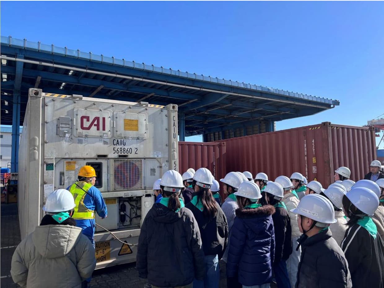 見学会は、三鷹市立高山小学校5年生約180人を対象に、海事産業の重要性への理解を深めることを目的に実施されたもの。当日はターミナル構内を見学し、実際にコンテナ内部へ入り、温度管理機能や高い密閉性を体感した。