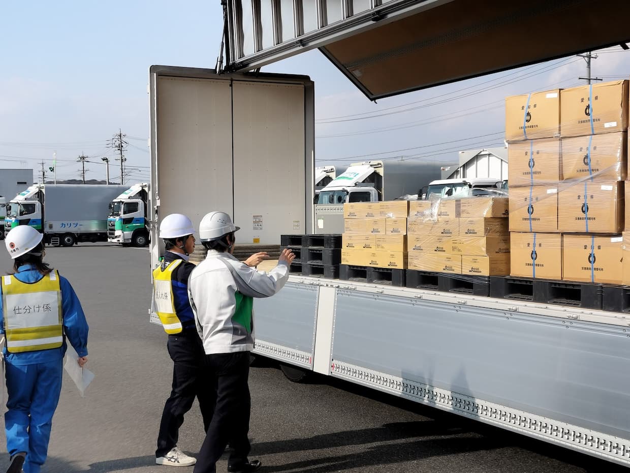 同訓練は大規模災害発生時を想定し、飲料水や毛布などの支援物資を迅速かつ確実に被災地へ届ける体制を確認するもの。当日は実際の物資を使用し、フォークリフトによる仕分けや輸送の実技訓練を実施したほか、デジタルシステム「B-PLo」を活用し、必要物資の数量や配送先を把握する手順を検証した。