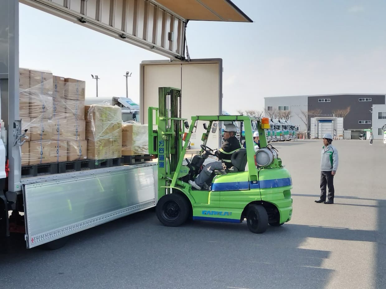 ▲フォークリフトを使用し、貴重な物資を安全・確実に仕分ける訓練(出所:カリツー)