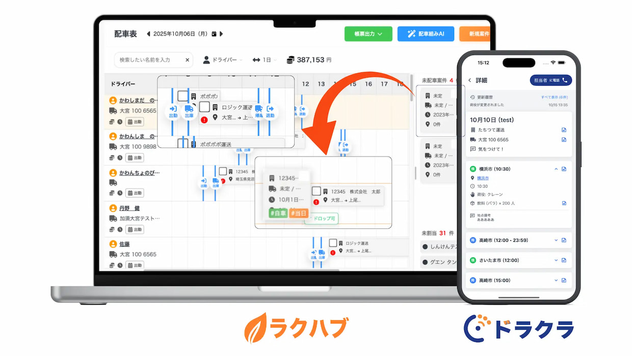 ドライバー向けアプリ「ドラクラ」(1台月額450円)と連携し、配車情報をスマートフォンへリアルタイム配信。AI(人工知能)翻訳機能も搭載する。さらに案件入力AIを開発中で、30案件を約3分で入力、精度90%超を実現したという。中小運送事業者の業務標準化と経営可視化を支援するデジタル基盤として展開を進める。
