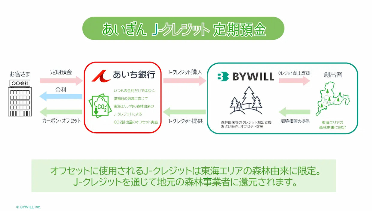 同商品は法人向け定期預金で、満期時の元本額に応じて東海エリアの森林由来J-クレジットによるカーボン・オフセットを付与する仕組み。バイウィルは静岡、愛知、岐阜、三重などの森林整備で創出されたJ-クレジットを調達し、預金者に代わって無効化手続きを行う。