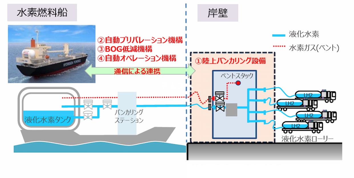 開発では、大型水素燃料船への液化水素バンカリング(燃料補給)において、安全を確保しながら作業員数の削減、誤操作リスクの排除、作業時間の短縮、BOG(ボイルオフガス)発生量の低減を実現する自動化技術を確立する。陸上バンカリング設備と水素燃料船の双方に適用し、試験・実証を行う計画だ。