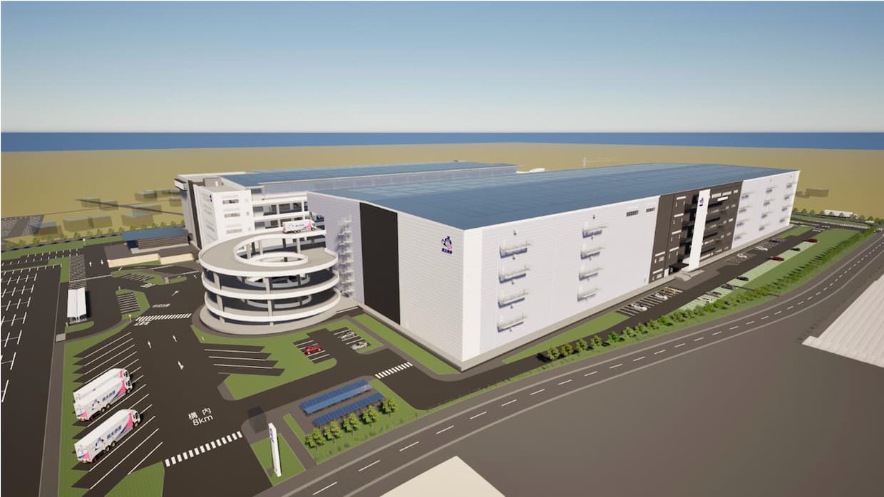 同センターは埼玉県松伏町に位置し、敷地面積11万6379平方メートル、延床面積12万1370平方メートル。構造はPCaPC造の免震構造で、非常用発電機1400キロボルトアンペアや顔認証セキュリティーを備える。着工は2026年3月、完成は28年9月を予定し、総投資額は489億円。