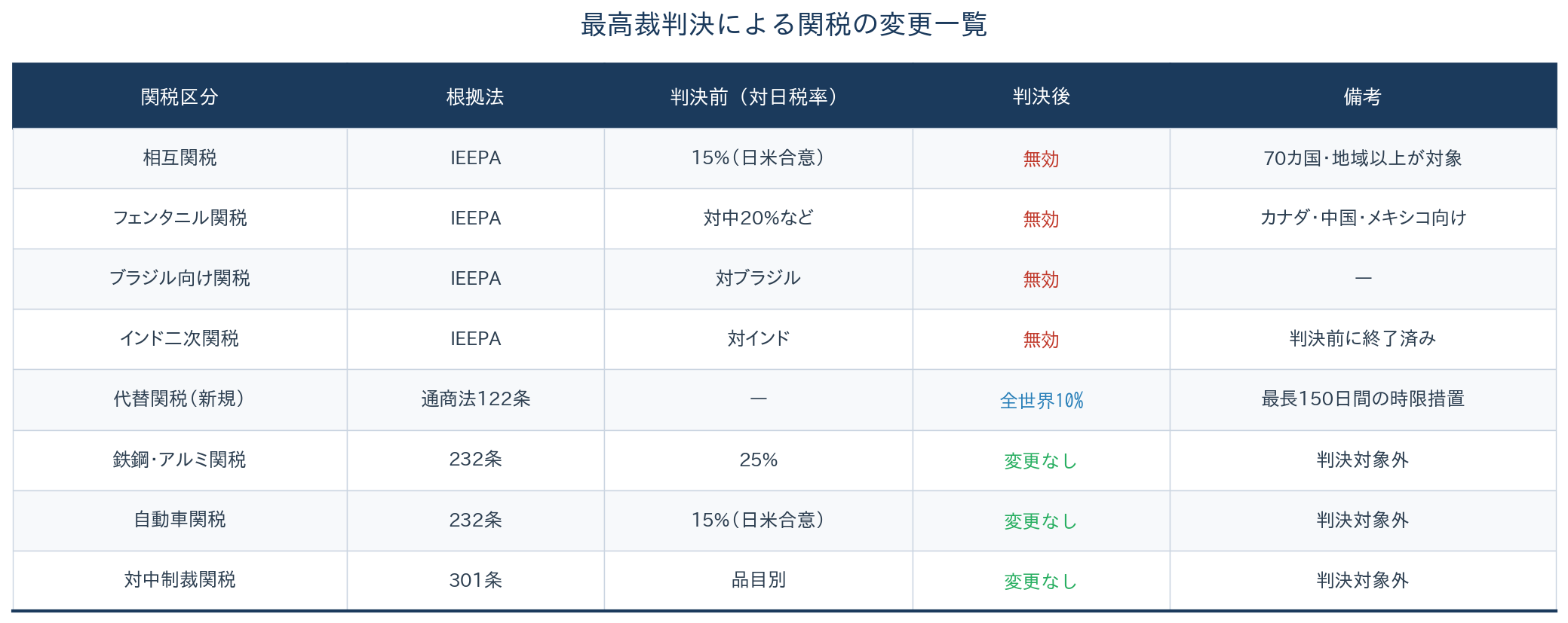 この判決で無効となったのは、カナダ・中国・メキシコ向けフェンタニル関税、70カ国・地域以上を対象とした相互関税(いわゆる「解放の日」関税を含む)、ブラジル向け関税、インド向け二次関税だ。日本に対しては25年7月の日米合意でIEEPA関税率が15%に設定されていたが、その法的根拠が消滅した。
