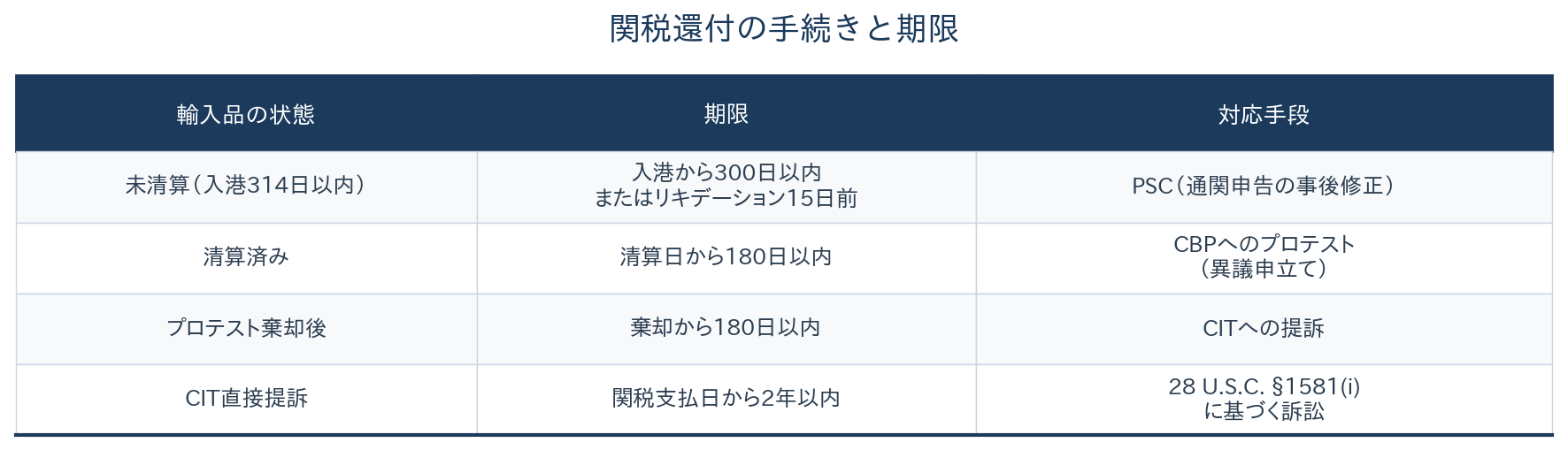 清算済みの貨物については、清算から180日以内にCBPに異議申立て(プロテスト)を行うか、国際貿易裁判所(CIT)に直接提訴する必要がある。CITは25年12月の裁定で、再清算と還付を命じる権限があると確認しており、提訴期限は「争われる行為」から2年間とされている。