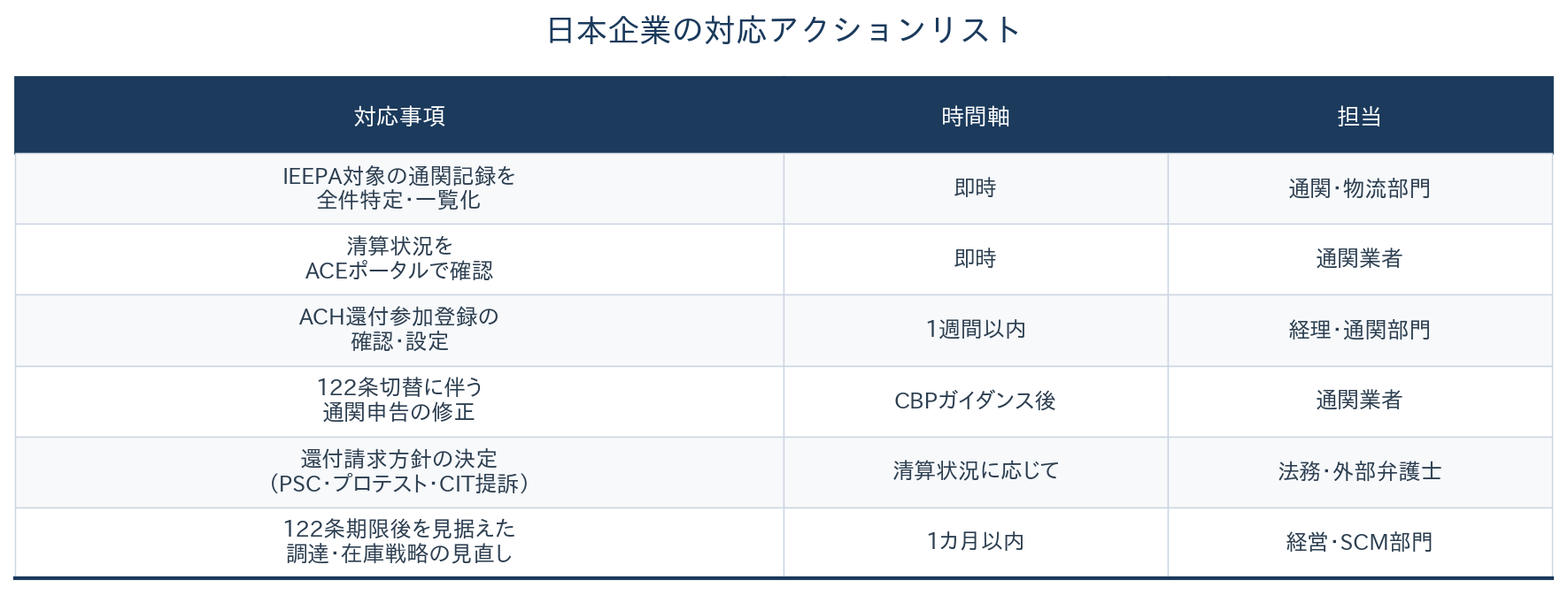 まず通関データの棚卸しが最優先だ。IEEPA関税の対象となった全ての通関記録を特定し、品目別の税額、清算状況、清算見込み日を一覧化する。ACEポータルへのアクセスが未設定であれば早急に登録する。CBPは26年2月6日から還付を電子送金(ACH)に一本化しており、ACH参加登録も必要だ。