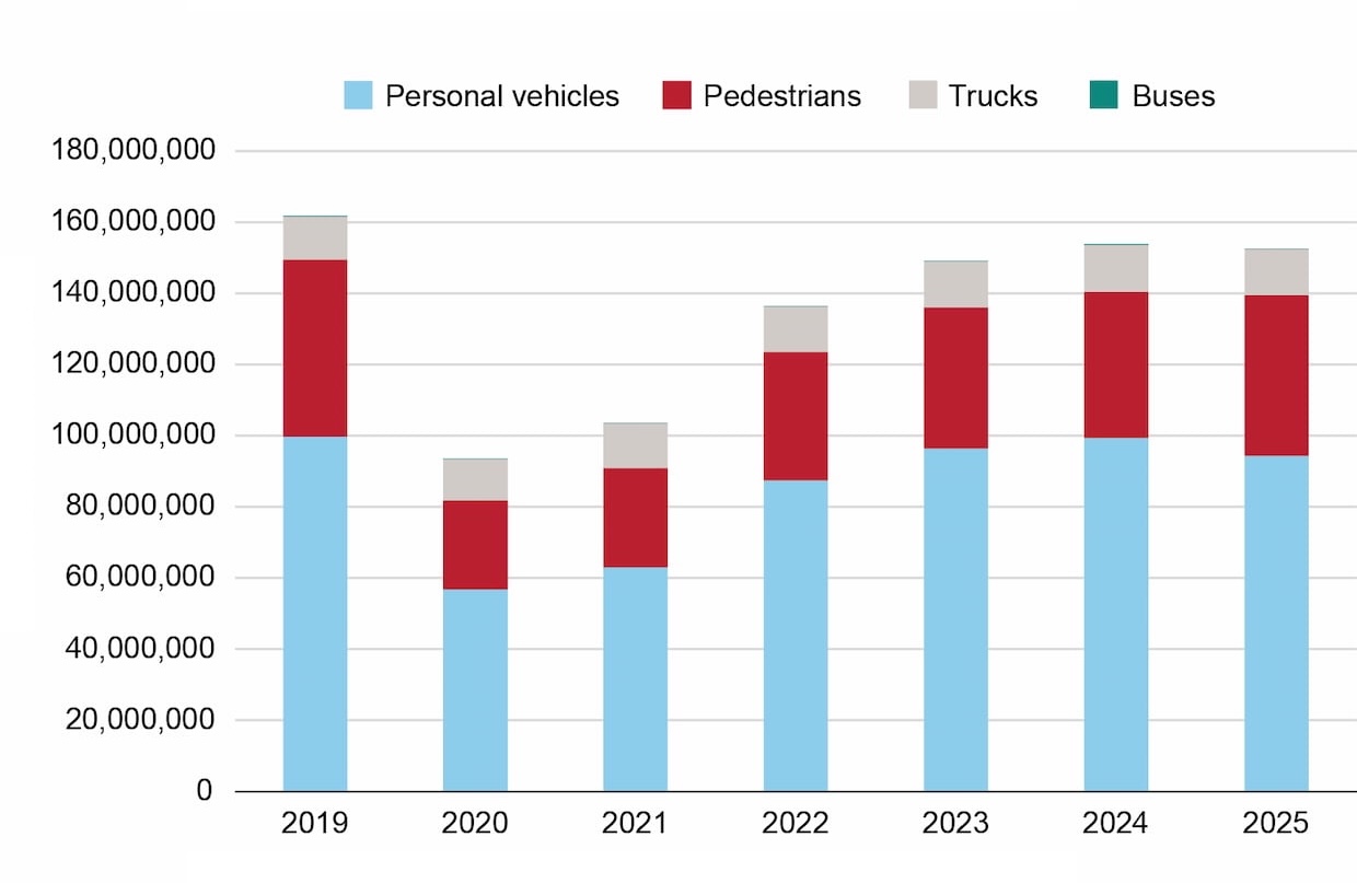 調査・データ米国運輸統計局(BTS)が20日まとめた2025年の陸上国境通過データによると、米国に流入する商用トラックの通過回数は1285万6744回となり、前年から2.4%減となった。一方で、コロナ禍前の19年比では6.1%増と、主要輸送モードの中で唯一、パンデミック前水準を上回る状態を維持している。