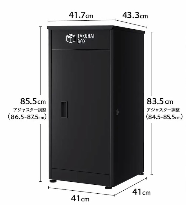 本体サイズは41.7センチ×86.5-87.5センチ×43.3センチ、重量は16キロ。材質は亜鉛メッキ鋼板を採用した。脚部にアジャスターを標準装備し、玄関先の段差や傾斜地でも水平設置が可能。従来のアンカー固定に加え、底面にスライドブロック連結用の穴を設け、市販ブロックとボルトで固定できる仕様とした。上蓋はダンパー式の自動クローズ構造に変更し、閉め忘れによる雨濡れや盗難リスクを抑える。印鑑収納スペースも備える。