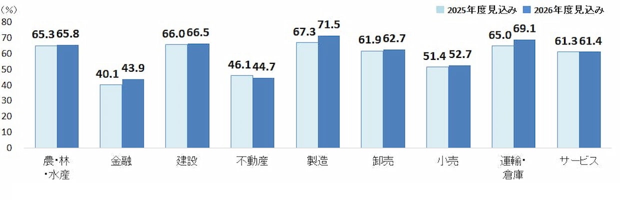 従業員数別では「51-100人」「21-50人」で7割を超え、中規模企業で賃金改善の動きが目立った。他方、「5人以下」は41.6%、「1000人超」は48.1%にとどまり、小規模企業での実施割合が低い。業界別では「製造」が71.5%で最も高く、「運輸・倉庫」69.1%、「建設」66.5%が続いた。