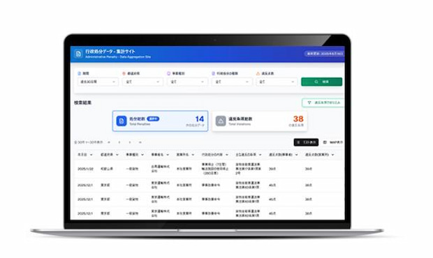 同社は2025年10月にAIとオープンデータを活用した研究開発プロジェクトを立ち上げており、今回のサービスは国土交通省が公表する行政処分結果を対象に、AIで収集・分析し可視化するもの。トラック、バス、タクシー事業者に対する監査結果や処分内容を、業種や違反類型、期間などの条件で検索できる。
