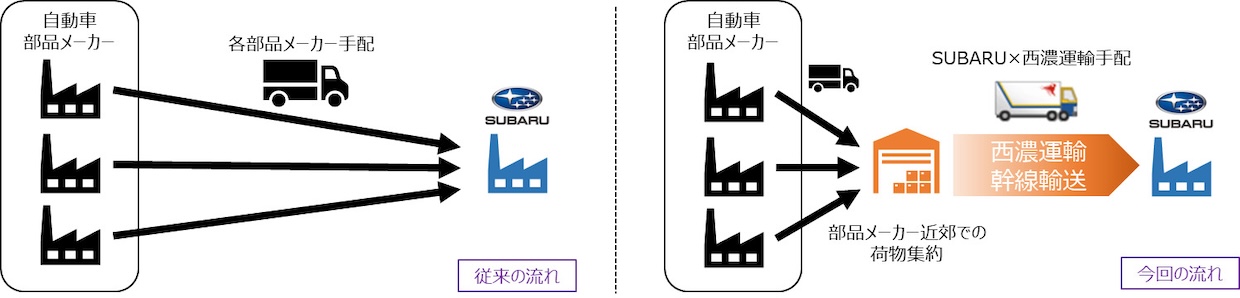協業の第1弾として、SUBARUが2月から群馬製作所矢島工場で生産を開始したバッテリーEV向け部品の輸送で、長距離混載輸送を導入する。西濃運輸豊川支店を中京地区の集約・発送拠点と位置付け、セイノーグループの全国輸配送網を活用して幹線輸送を行う。複数メーカーの部品をまとめて運ぶことで積載率を高め、長距離輸送の効率向上を図る。