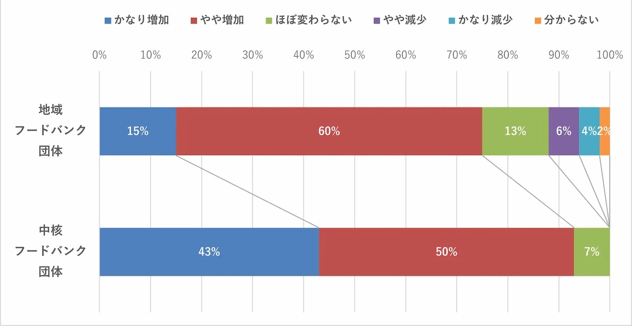 調査は全国のフードバンク団体295を対象に実施され、中核フードバンクと定義された団体では、支援依頼件数が前年から「かなり増加した」と回答した割合が43%に達した。地域フードバンクの15%を大きく上回り、広域的な食品集約・分配機能への負荷が急速に高まっている。